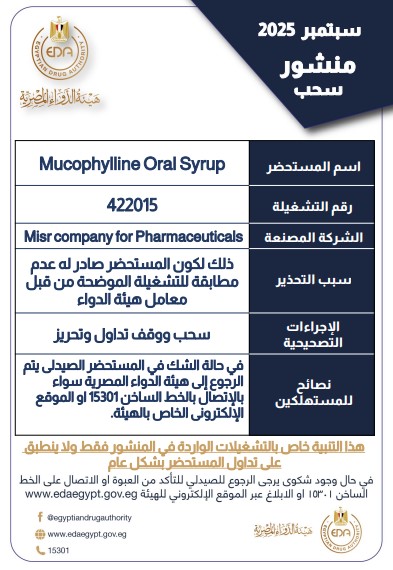 الهيئة أوضحت في منشور رسمي، أن التحذير يخص التشغيلة رقم "422015" من دواء "MucophyllineOral Syrup"؛ لكون المستحضر صادر له عدم مطابقة من قِبل معامل هيئة الدواء.